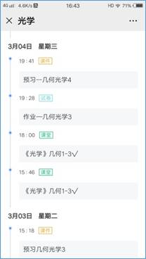 在预习阶段的设计上,李老师利用雨课堂发送预习资料的功能,在每堂课课前都会发布预习课件。课件内容主要包括两部分:一是充分利用雨课堂智慧教学平台的慕课资源,精心挑选慕课视频。慕课视频的最大优势是短小精悍,既不使学生感到冗长,又能对学生的学习给予启发;二是提出阅读本节课教材内容的要求。除此之外,李老师还给同学们推荐了awc777万象城娱乐官网网络教学平台上的优秀《光学》课程视频网址、国家级《光学》精品课视频网址等,让同学们根据自己的需要选择观看。