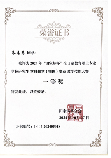 2024年10月,朱志慧同学在全国“田家炳杯”全日制教育硕士专业学位研究生学科教学(物理)专业教学技能大赛决赛中斩获佳绩,获得全国一等奖的优异成绩,展现了过硬的教学专业技能和较高的师范生素养,此份成绩同时也是校内外指导老师团队对研究生培养机制的正向反馈与实践结果的呈现。同时,田靖越、张慧蕊同学也入围决赛获得优秀教学设计奖。