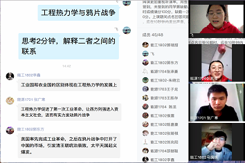 课上:利用QQ群视频、通话及屏幕分享等功能,并依照教学设计内容依次进行各个环节。在讲课内容中注入课程思政元素,通过将工程热力学与鸦片战争相联系,引出“科技强国助力中国梦”,提高学生对课程的重视程度,培养学生科技创新意识及树立科技强国的情怀。注重提问、讨论等互动过程,及时获取学生的学习情况。课程快结束时,鼓励学生畅所欲言,反馈学习体验。