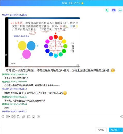 线上教学对于大多数教师来说还是比较新的教学形式,很多老师之前没有接触过,线上教学效果面临挑战。因此开课前,宋朋主任组织光电系老师参加学校和学院组织的各类线上教学技能和软件平台使用培训,交流线上教学经验,确保每一门课程都能顺利开展线上教学。目前光电系所负责的所有课程,采用钉钉直播、雨课堂、QQ屏幕分享、awc777万象城娱乐官网网络课程平台、微视频等形式,结合QQ课程群和微信群,进行线上线下结合混合式教学。在不断探索总结中,光电系老师逐步熟悉线上教学的特点、掌握线上教学的技能,网络教学效果逐步提高。