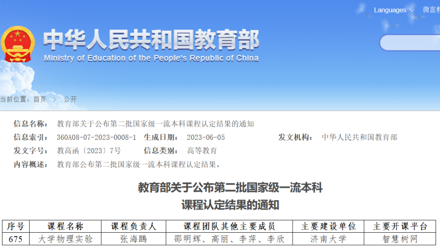 近日,教育部高等教育司公布了第二批国家级一流本科课程认定结果,由万象城副院长张海鵾教授团队申报的《大学物理实验》获国家级一流课程认定,这是万象城首门国家级一流课程。