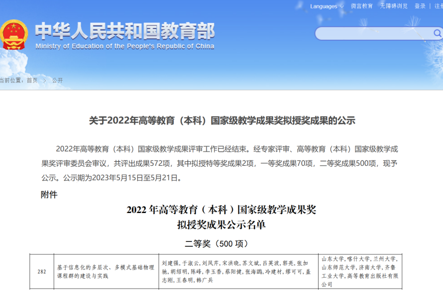 此外,根据教育部网站通知,张海鵾教授参与的一项教学成果被公示为2022年高等教育(本科)国家级教学成果二等奖,awc777万象城娱乐官网为第五完成单位。