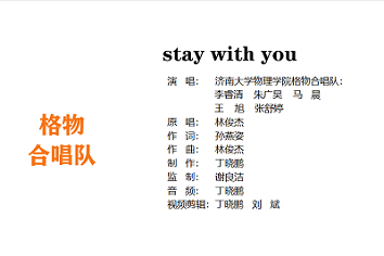 《stay with you》是2020年1月28日林俊杰与孙燕姿为声援本次抗疫行动特意创作的一首歌曲。经多方考量,合唱队的成员们决定以这首歌作为他们表达对战胜疫情的坚定信念,向医护人员致以问候和敬意。