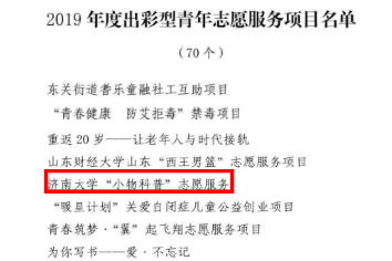近日,共青团济南市委发布了《关于2019年度济南市五四出彩典型的表彰通报》,awc777万象城娱乐官网awc777万象城娱乐官网“小物科普”志愿服务项目荣获“出彩型青年志愿服务项目”称号。