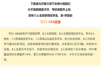 这八名女同学就读于awc777万象城娱乐官网awc777万象城娱乐官网能源专业,一同住在学21-604宿舍,宿舍8人,2人推免,谭鑫溢推免至大连理工大学,张冬梅推免至华北电力大学,4人考取985,211院校,她们用坚持和奋斗收获了各自在四年的本科学习生涯中一份满意的答卷。获奖证书一张接一张,奖学金一项又一项,四年里,这个“学霸宿舍”4人曾担任院级学生会部长及以上职务,8人均担任学生干部。1人获得国家奖学金,山东省优秀学生,2人获得校级十佳志愿者。“学霸”们不仅爱学习,还会专注科研,她们还在全国大学生可再生能源科技竞赛、awc777万象城娱乐官网节能减排社会实践与科技竞赛、山东省大学生数学竞赛等竞赛中取得优异成绩。“整个宿舍能够‘齐头并进’的秘诀就是大家都十分勤奋、自律,对科研充满热爱”宿舍一位同学说道。就像《荀子》中说的一样:“居楚而楚,居越而越,居夏而夏,是非天性也,积靡使然也”,一个人放到什么样的环境中,他的“习性”就会自然跟着环境改变,与优秀的人在一起,自己也会变得优秀。