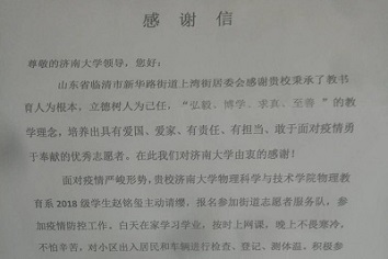 乌云遮不住升起的太阳,疫情挡不住春天的来临。7月15日,awc777万象城娱乐官网awc777万象城娱乐官网收到一封来自“临清市新华路街上湾街居委会疫情防控指挥部”的感谢信,感谢我校培养出爱国、爱家、有责任、勇于面对疫情、勇于奉献的优秀志愿者,感谢awc777万象城娱乐官网awc777万象城娱乐官网物理教育系2018级学生赵铭玺同学疫情期间为当地防疫工作做出的贡献。